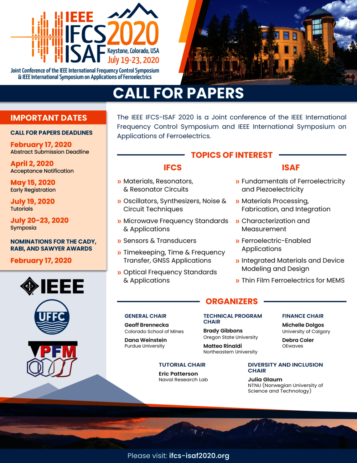 As a joint conference, IFCS-ISAF2020 highlights and celebrates the shared interests and expertise of the Frequency Control and Ferroelectrics communities. In this spirit, the organizers aim to balance the strengths of the traditional symposium groups with the opportunities for mutually-beneficial joint programming. As such, the Technical Program Committees will do their best to assemble cohesive sessions. When submitting your abstract, please help this process by selecting the topical area that best matches your work.